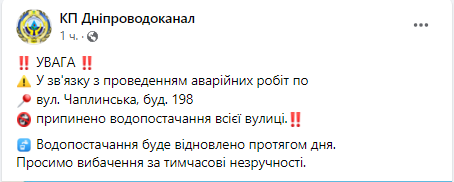 Так, у зв'язку з проведенням аварійних робіт на вул. Чаплинській, 198 припинено водопостачання всієї цієї вулиці.
