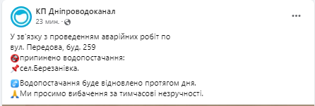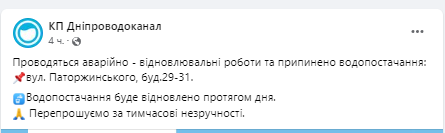 Так, у зв'язку з проведенням аварійних робіт припинено водопостачання: