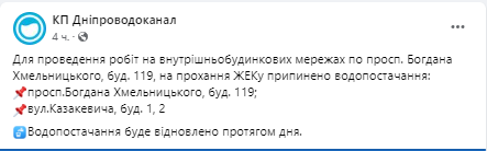 Крім того, для проведення робіт на внутрішньобудинкових мережах на просп. Богдана Хмельницького, 119 на прохання ЖЕКу припинено водопостачання: