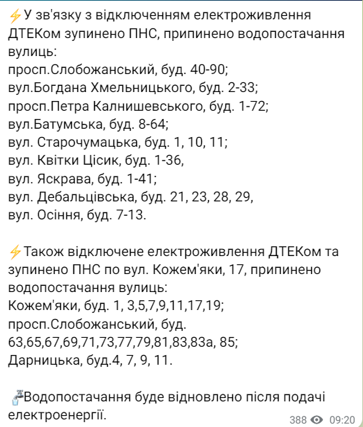 Водопостачання буде відновлено після подачі електроенергії.