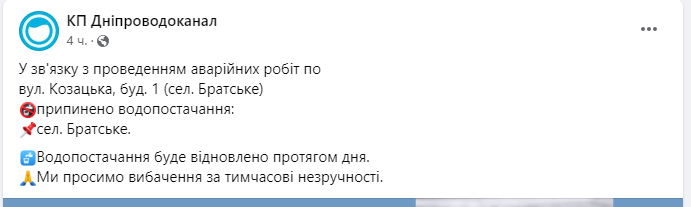 Про це повідомляє КП "Дніпроводоканал".