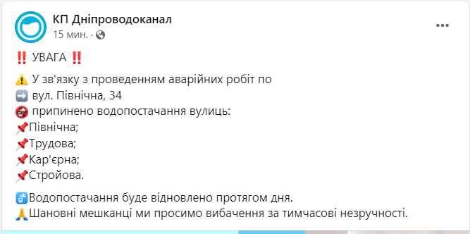 Аварійні роботи: які вулиці у Дніпрі залишилися сьогодні без води