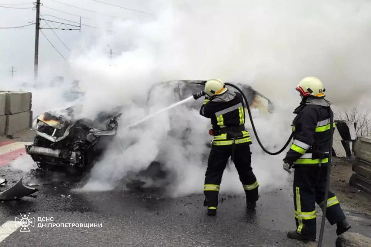 У ДСНС також показали фото з місця ДТП та зазначили, що в результаті зіткнення легковий автомобіль спалахнув. Вогонь оперативно ліквідували.
