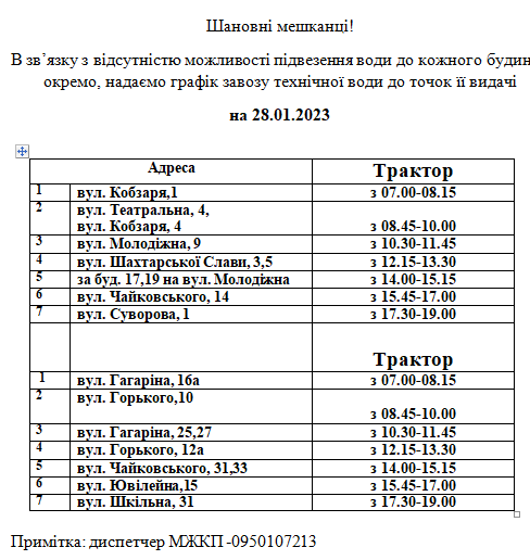 Подача води для мешканців Тернівки здійснюватиметься в аварійному режимі із резервуарів 28 січня з 08:00 до 10:00.