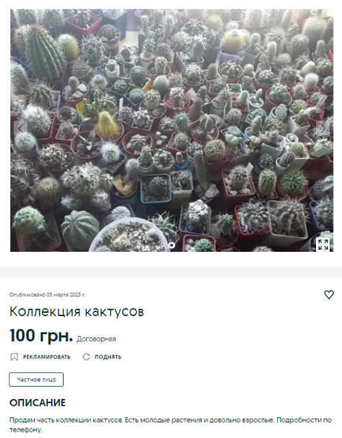 Колекцію різних кактусів можна купити у Дніпрі по 100 грн за експонат. Скільки горщиків у колекції – власник не каже, як і є там незвичайні та рідкісні експонати. Він лише зазначає, що є як молоді рослини, так і досить дорослі.
