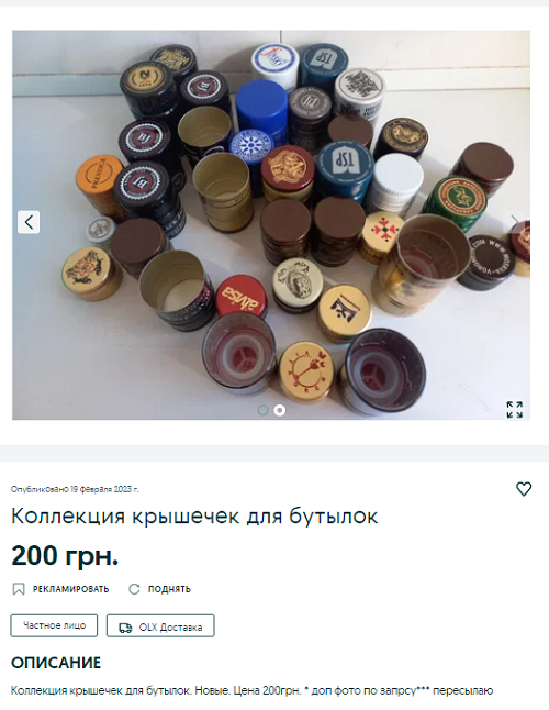 Незвичайну колекцію кришок для пляшок готові продати у Дніпрі за 200 грн. У «наборі» трохи більше ніж 30 експонатів. Судячи з фото, кришки було знято з горілчаних пляшок і не лише з них.