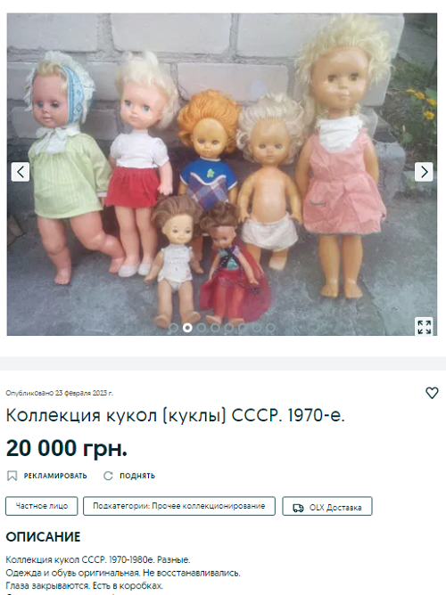 Колекцію дитячих ляльок 1970-х років випуску продають у Дніпрі за 20 тис грн. Одяг та взуття експонатів оригінальні, до них йдуть такі самі оригінальні коробки. Усього 7 експонатів.