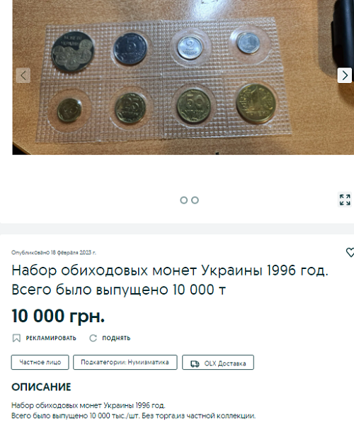 Набір українських монет 1996 року випуску коштує 10 тис грн. Як зазначає продавець, всього того року було випущено близько 10 тис. штук «повних» наборів монет від 1 до 50 коп. Тому зараз знайти «копієчку» 1996 року – велика рідкість.