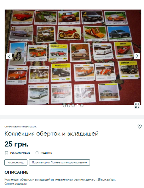 Багато хто в дитинстві збирав вкладки з жуйок, багато хто продовжує робити це досі. Купити у Дніпрі колекцію обгорток та вкладишів можна за ціною від 25 грн за штучку. Продавець зазначає, що оптом буде дешевшим.