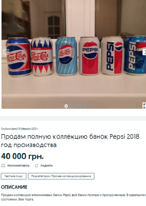 Колекцію алюмінієвих банок Pepsi 2018 їх господар оцінив у 40 тис грн. Зазначається, що це банки в ідеальному стані, повні, тобто з напоєм, але вже прострочені. Продають без торгів.