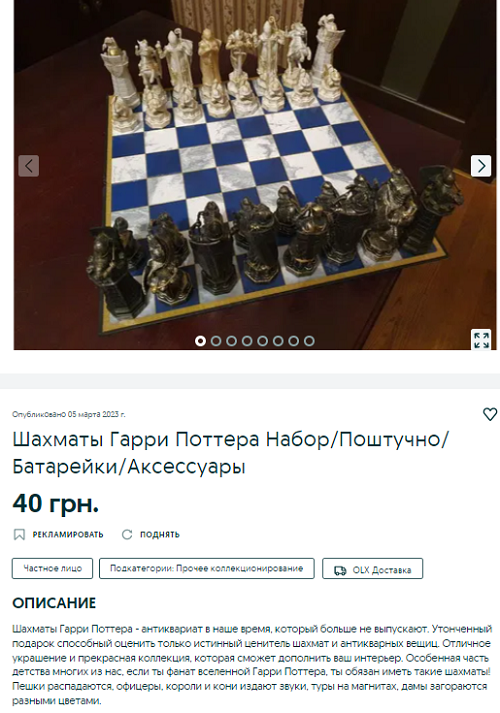 Шахи Гаррі Поттера можна купити за 2 тис грн. Але можливий продаж і поштучно. Для справжніх фанатів книги шахи продають від 40 до 60 грн. за штуку, залежно від значення фігури. Найдорожче – по 60 грн віддадуть Дам та Королів. Герби факультетів коштують по 50 грн за штуку.