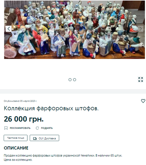 Колекцію фарфорових штофів у Дніпрі готові продати за 26 тис. грн. Штоф - це така посудина, куди раніше наливали алкоголь, але помістити туди можна будь-яку рідину. У колекції 65 штофів, всі оформлені в українській народній тематиці: це козаки та дівчата у національному одязі.