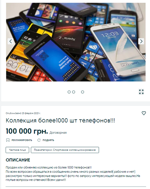 Незвичайну колекцію, що складається з понад тисячі мобільних телефонів, готові продати за 100 тис грн. Як зазначає продавець, серед експонатів є робочі та не робочі моделі. Також можливий обмін одних телефонів на інші. У колекції є кнопкові, сенсорні телефони різних марок та форм.