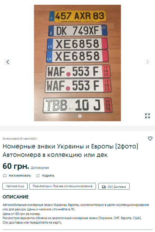 Один автомобільний номер у Дніпрі можна купити за 60 грн. Власник розпродає свою колекцію автознаків та зазначає, що у його «наборі» є не лише номерні знаки України, а й інших країн ЄС. Можливий варіант обміну на аналогічні номерні знаки країн Європи або США. Знаки продають виключно для колекціонування або для декору.
