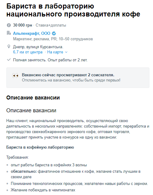 30 тис грн може заробити у Дніпрі бариста у лабораторії національного виробника кави. Серед вимог «фанатичне ставлення до кави, бажання стати найкращим у своїй справі» та розуміння технологічних процесів, бажаний навик роботи із зерном та досвід роботи з кавою.