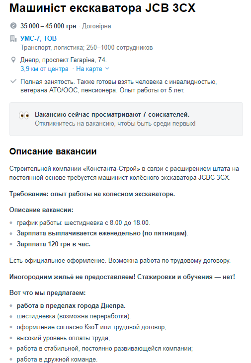 Від 35 до 45 тис. грн може отримувати машиніст екскаватора в будівельній компанії. Працювати потрібно буде шість днів на тиждень з 8:00 до 18:00, зарплату можна буде отримувати щотижня.
