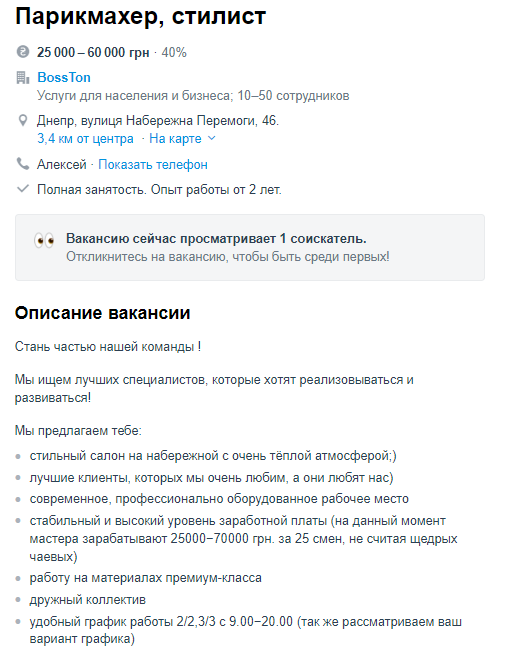 Від 25 до 60 тис грн може заробити перукар-стиліст у салоні у Дніпрі. На місяць потрібно буде відпрацювати 25 змін з 9:00 до 20:00. Серед вимог: креатив та навички створення дизайну, життєрадісність претендента, комунікабельність та якісне виконання послуг.