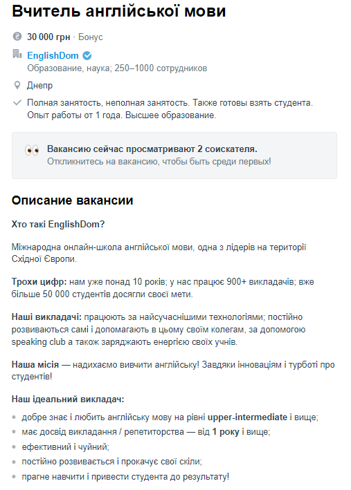 Стільки ж може заробити вчитель англійської мови у профільній онлайн-школі. Обіцяють, що не потрібно буде шукати студентів для навчання, графік роботи буде гнучкий, регулярне відвідування тренінгів та вебінарів за рахунок фірми, а також видадуть інтерактивні підручники.