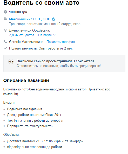 100 тис грн платитимуть водієві зі своїм авто, якщо у нього є машина, здатна перевозити понад 20 тон вантажу, а також посвідчення водія європейського зразка. Їздити треба буде закордон та назад. Серед інших вимог: знання «начиння» автомобіля, вміння його ремонтувати, досвід роботи, порядність та пунктуальність.
