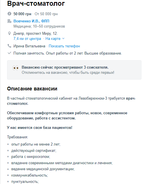 50 тис грн може заробити лікар-стоматолог із досвідом роботи від 2-х років. Компанія обіцяє комфортні умови роботи, базу пацієнтів, сучасне обладнання та асистента на додачу. Від потенційного претендента – вміння працювати з мікроскопом, володіння сучасними методами діагностики та лікування, пунктуальність та діючий сертифікат.