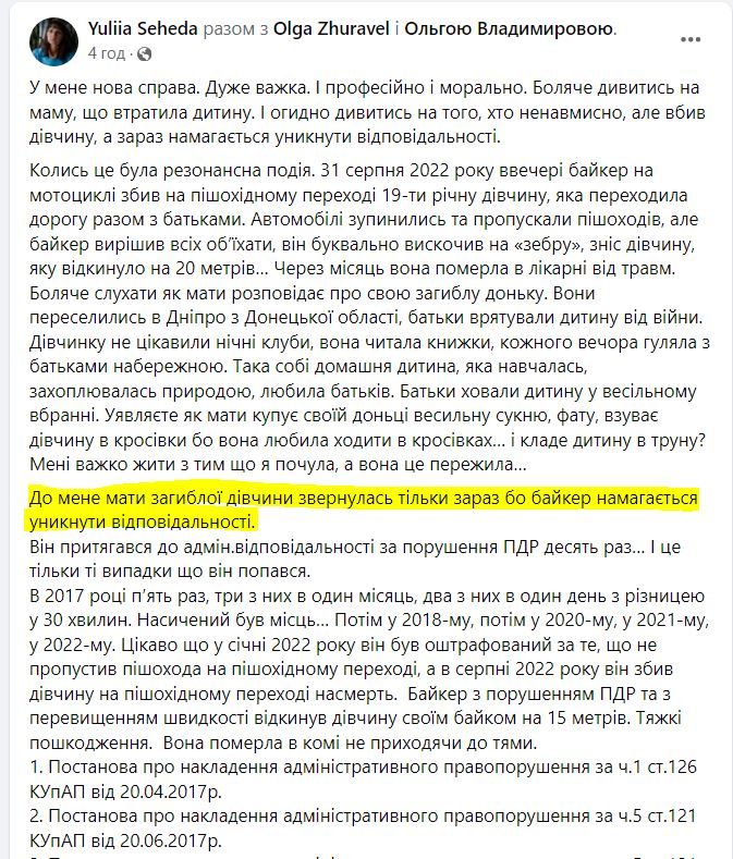 У мене нова справа. Дуже важка. І професійно і морально. Боляче дивитись на маму, що втратила дитину. І огидно дивитись на того, хто ненавмисно, але вбив дівчину, а зараз намагається уникнути відповідальності, - написала Юлія Сегеда на своїй Facebook-сторінці.