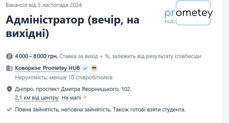Коворкінг на проспекті Дмитра Яворницького шукає адміністратора на вечірні зміни та вихідні.