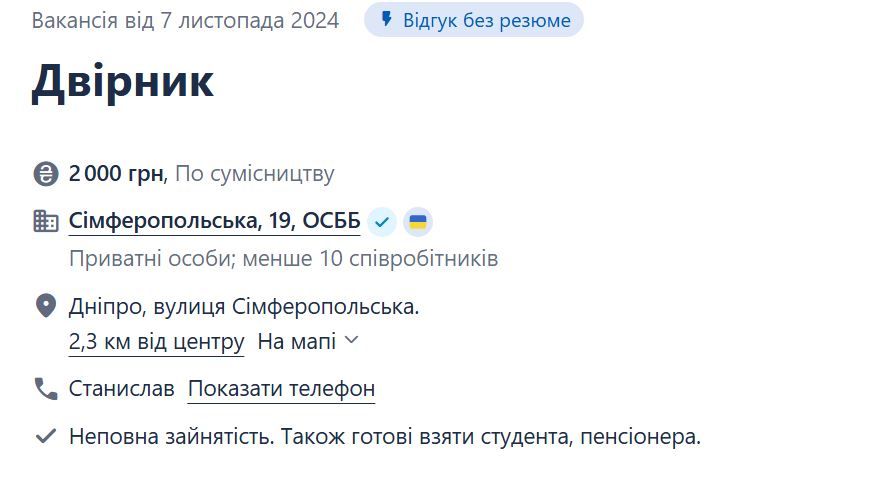 До ОСББ на вулиці Сімферопольській, 19 шукають двірника. Обіцяють неповну зайнятість - 2 дні на тиждень по 2-3 години. Робота підійде як підробіток до основної праці.
