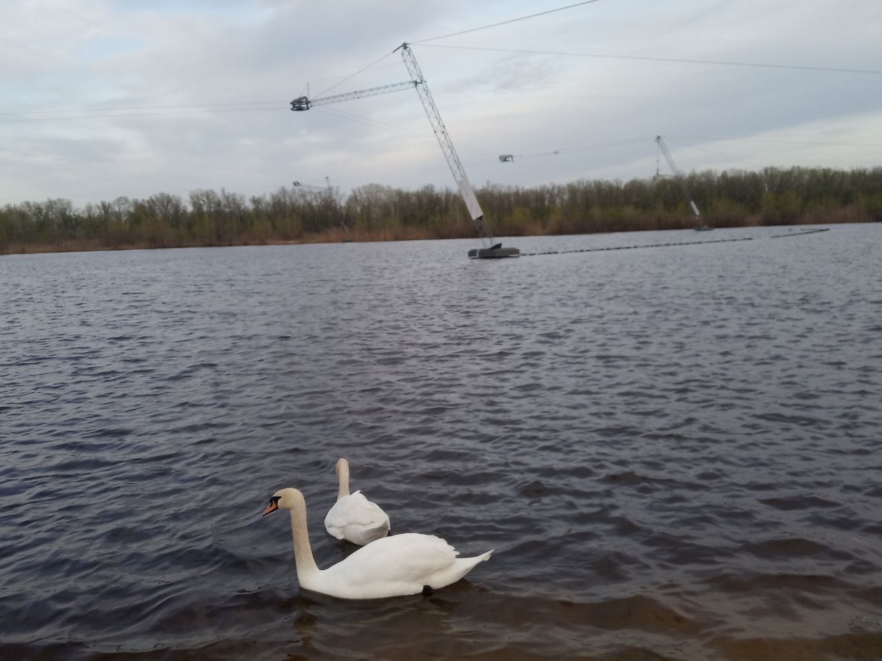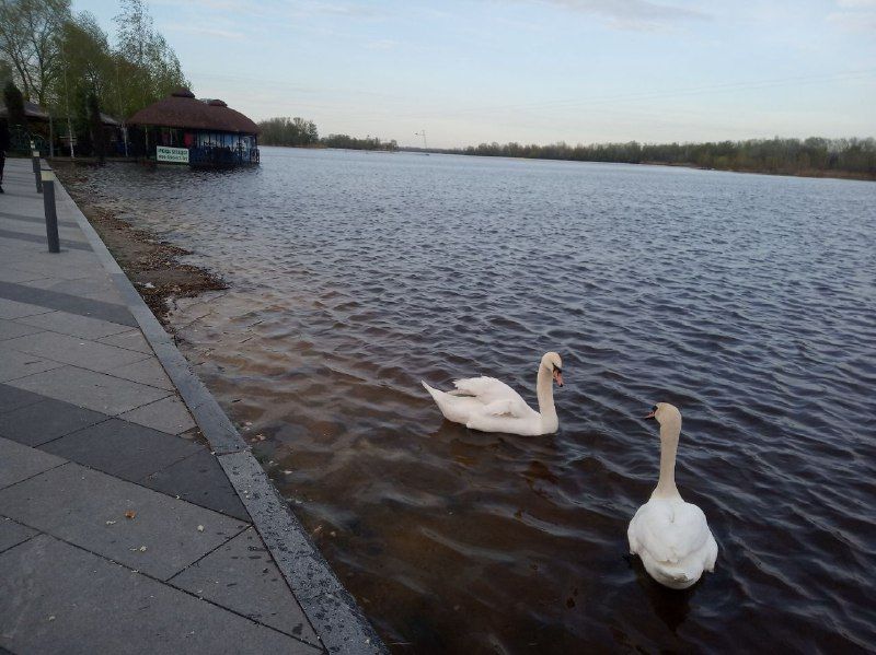 Білі красені: до сквера "Прибережного" через підняття рівня води прибилося два лебеді