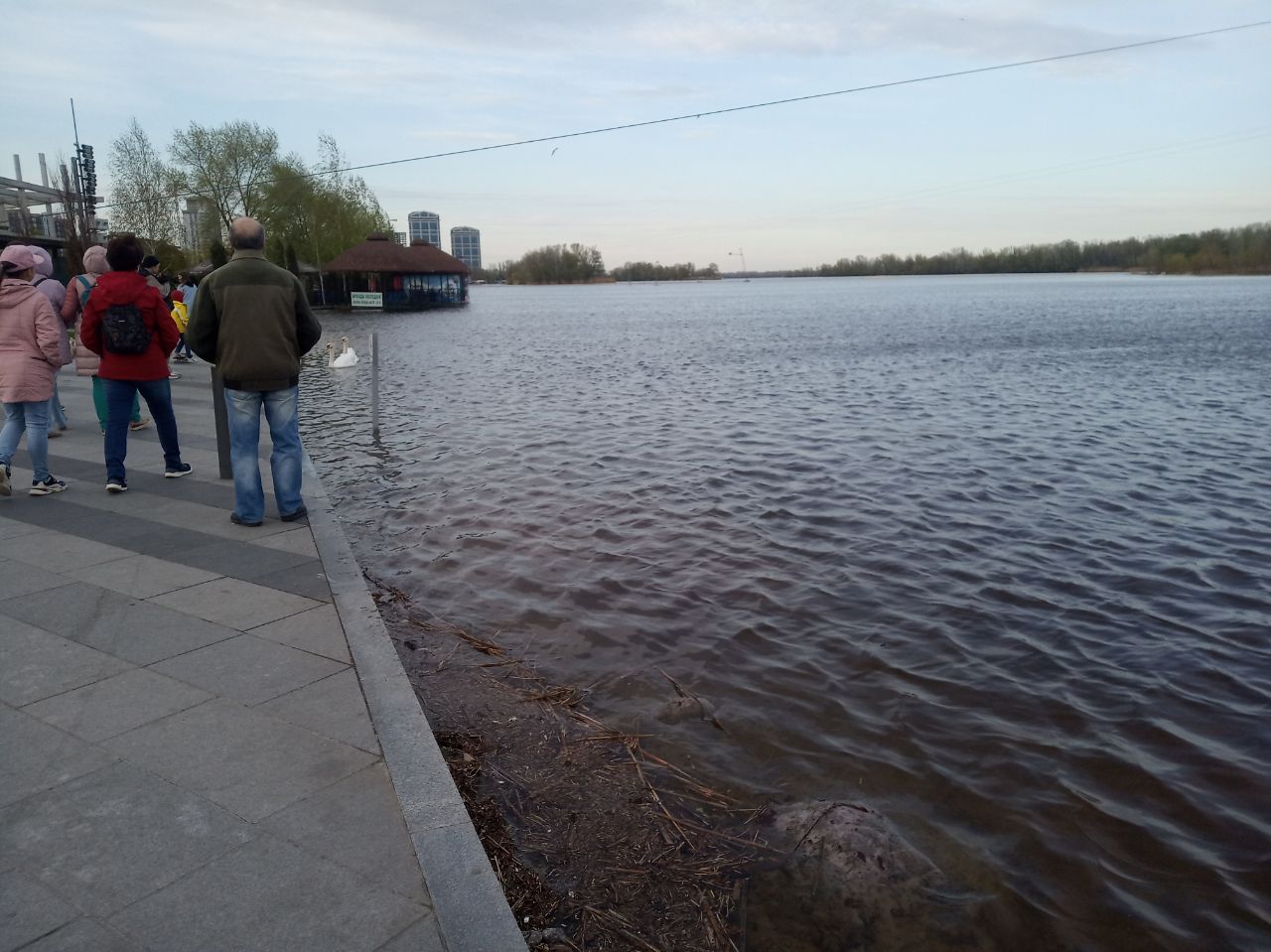 Води побільшало і біля скверу "Прибережного". Туди з водою навіть приплила пара диких лебедів.