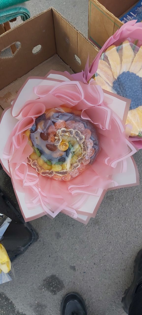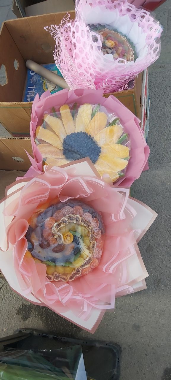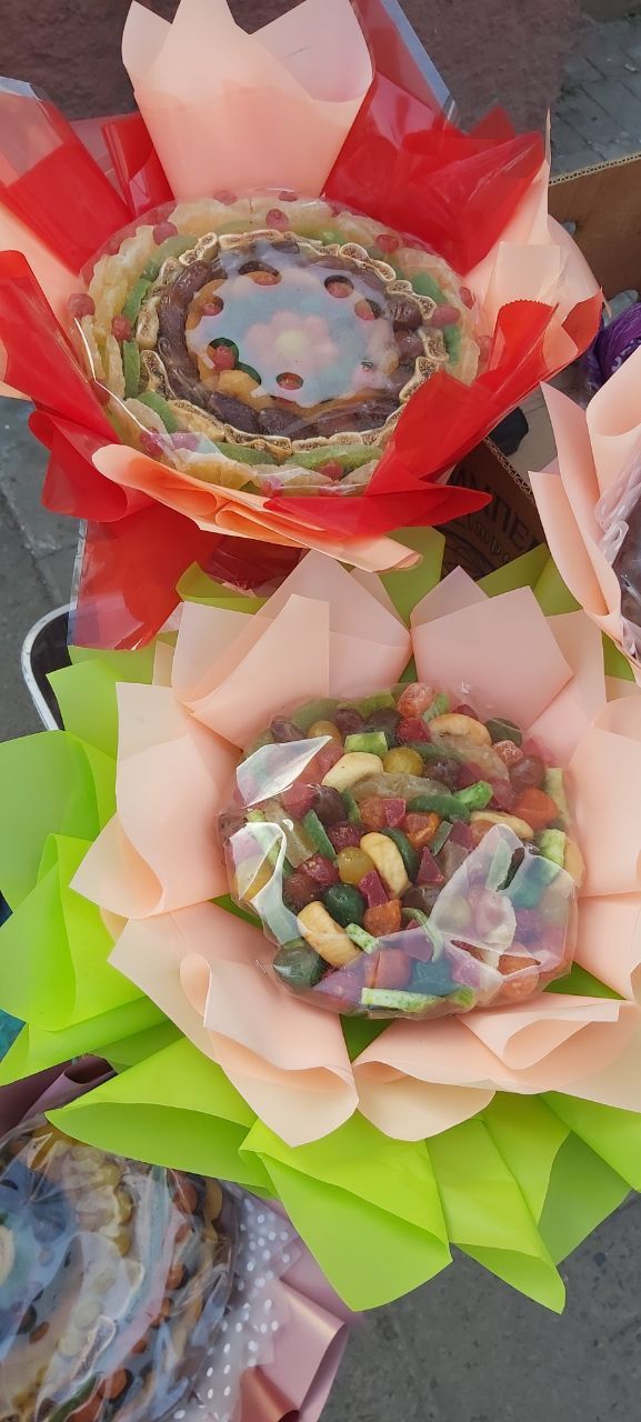 Для тих, хто не хоче бути банальним та купувати квіти, є альтернатива - ось такі їстівні букети з цукатів. Їхня ціна - від 650 до 800 грн (усе залежить від ваги букета та складу).