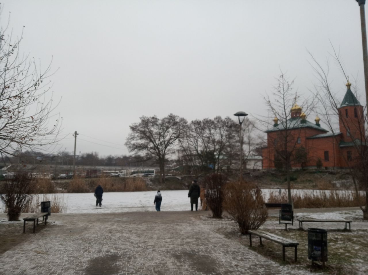 Біля церкви на Перемозі діти разом з дорослими катаються на ледь замерзлому озері (ФОТО)
