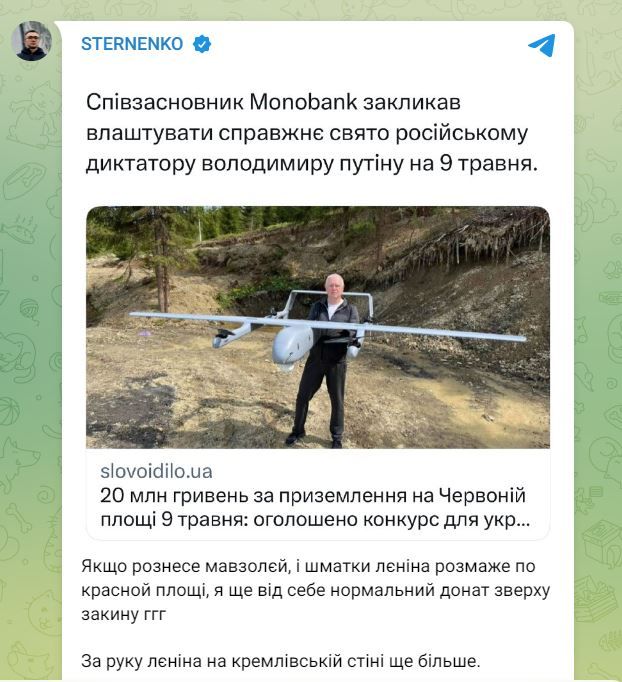 Отже, я офіційно встановлюю премію українському виробнику БПЛА, чий літак, звісно за допомогою військових, долетить і приземлиться на червоній площі у Москві 9 травня, - написав він.