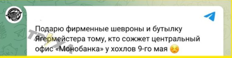 У z-пропагандистських телеграм-каналах відповіли на цю ініціативу. В одному із таких пообіцяли дати пляшку лікеру Jägermeister та фірмові шеврони, тому хто спалить центральний офіс "Монобанку".
