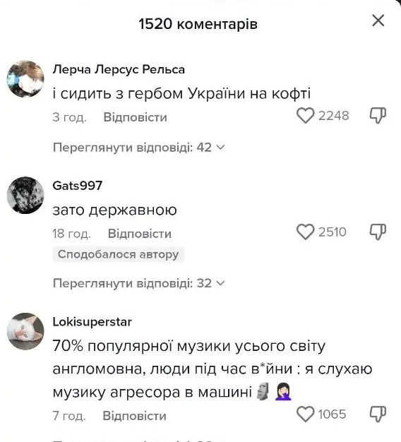 Анна сказала, що слухає музику російських виконавців через Apple Music. Зазначимо, що виконавці отримують прибуток від прослуховувань своїх пісень на різноманітних стрімінгових платформах, потім вони платять податки. Виходить, що українці, які слухають російську музику, спонсорують армію ворога.