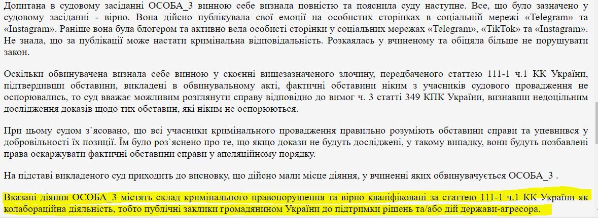 У тексті вироку зазначено, що обвинувачена таки визнала свою вину, тож ймовірно саме це спонукало суддів пом'якшити їй покарання, адже дії блогерки можна кваліфікувати за статтею 436-2 ККУ, тобто виправдання збройної агресії, і за це правопорушення вона могла отримати позбавлення волі на три роки.