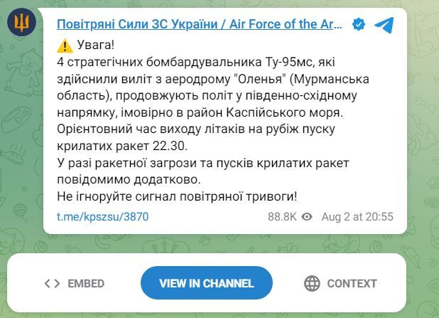 Бомбардувальники Ту-95мс несуть ракети Х-101, які здатна збивати наша ППО, проте все одно будьте обережні.