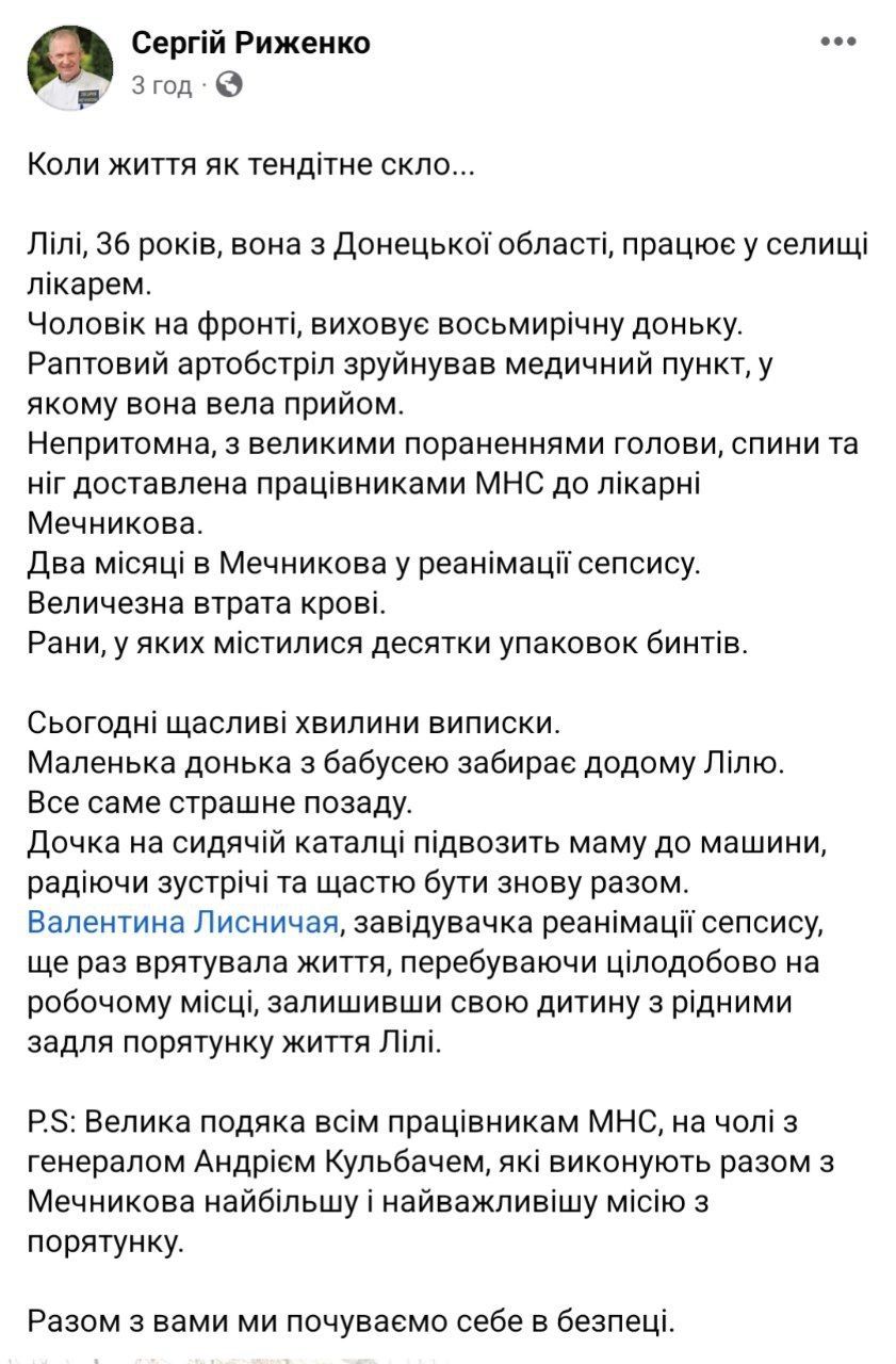 За його словами, у реанімації Дніпровської лікарні жінка провела два місяці. 36-річна Ліля потрапила під артобстріл, коли вела прийом хворих в одному з медичних пунктів на Донеччині.