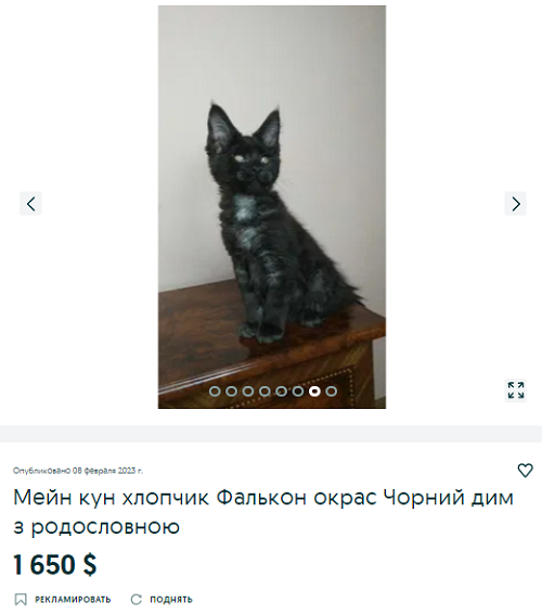 Трохи більше 61 тис. грн просять за хлопчика породи мейн-кун. Кошеняті виповнилося кілька місяців, воно має чорну «шубку» та яскраві очі. Котик має всі документи про щеплення і про родовід. Продають його за такою ціною, оскільки майбутній господар Фалькона (так звати кошеня) матиме право розведення породи.