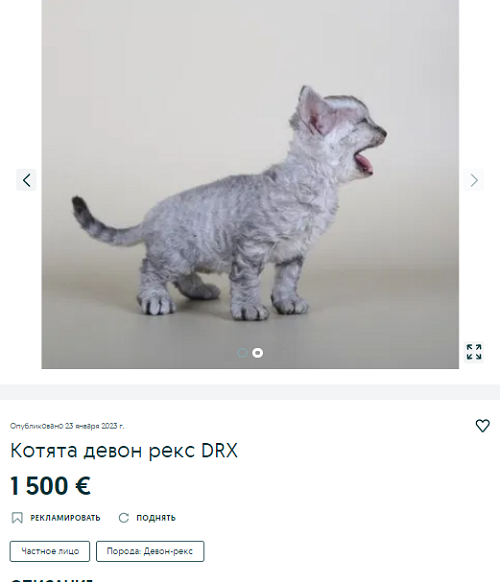 За 59,2 тис грн у Дніпрі можна купити кошеня породи девон-рекс. Домашньому звірятку вже виповнилося півроку. Порода відома своєю хвилястою шерстю і великими вухами, а також скулами, що виступають. Продавець кошеня нічого не говорить про документи та родовід.