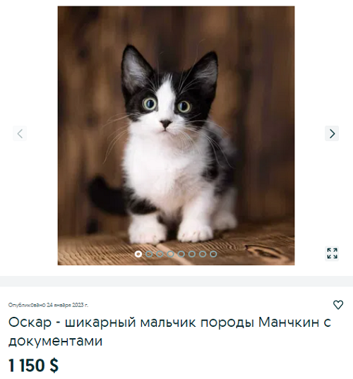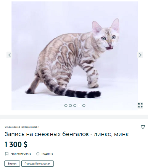За 48,2 тис. грн у Дніпрі продадуть кошеня породи бенгал. Щоправда, саме кошеня ще не народилося, його появи очікують лише у березні цього року. Продавець обіцяє, що в новий будинок кошеня потрапить вже з щепленням, кастроване і навчене ходити на лоток.