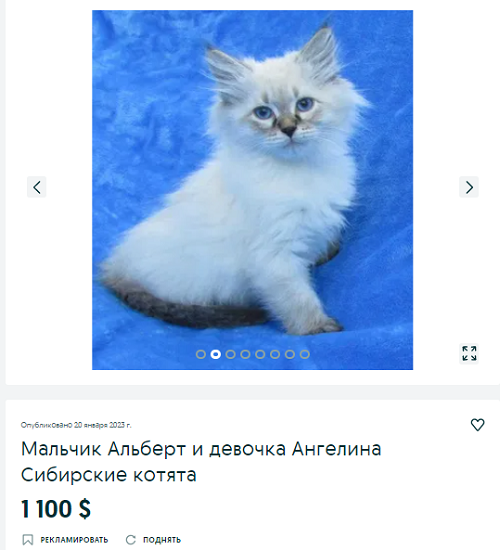 За пухнастого кошеня сибірської породи просять 40,8 тис грн. Вусатий щеплений відповідно до віку і має необхідні навички, щоб не псувати кути і диван у будинку нового господаря. Кішки цієї породи вважаються довгожителями і можуть бути поруч із господарем 20 років, а їхня вовна вважається гіпоалергенною. Вага звіра у дорослому віці може сягати 12 кг і це вважається нормою для породи.