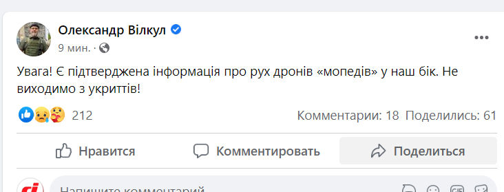 Увага! Є підтверджена інформація про рух дронів-«мопедів» у наш бік. Не виходимо з укриттів! - написав Вілкул.