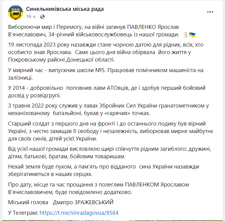 19 листопада 2023 року війна обірвала життя 34-річного воїна Ярослава Павленка. Сталося це у Покровському районі Донецької області.