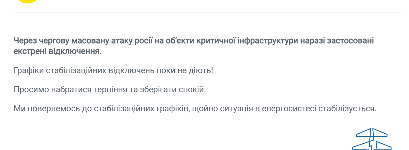 Просимо набратися терпіння та зберігати спокій. Ми повернемось до стабілізаційних графіків, щойно ситуація в енергосистемі стабілізується, - зазначили енергетики.