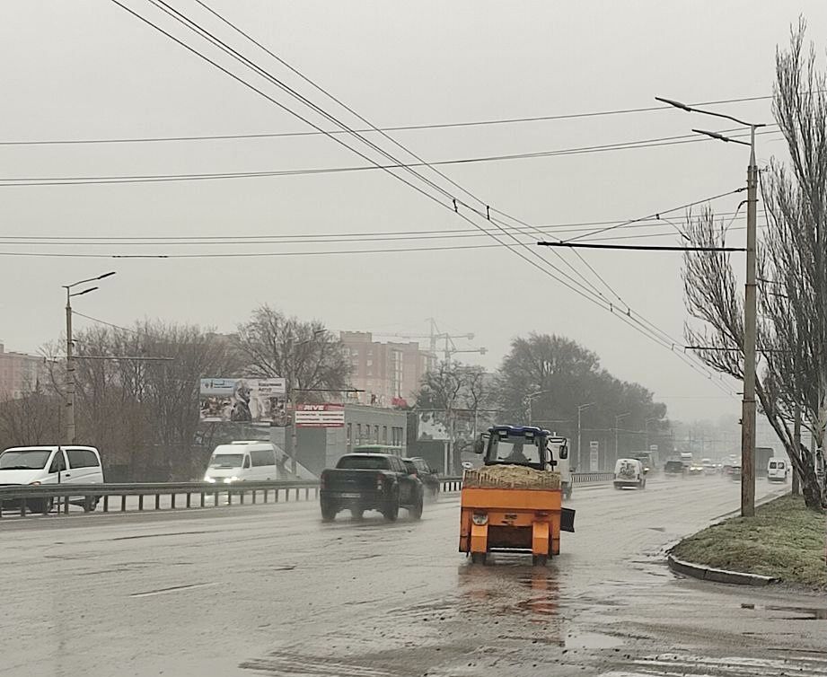 У Дніпрі через погіршення погодних умов (крижаний дощ із ожеледдю) спеціальна техніка виїхала на міські автошляхи.