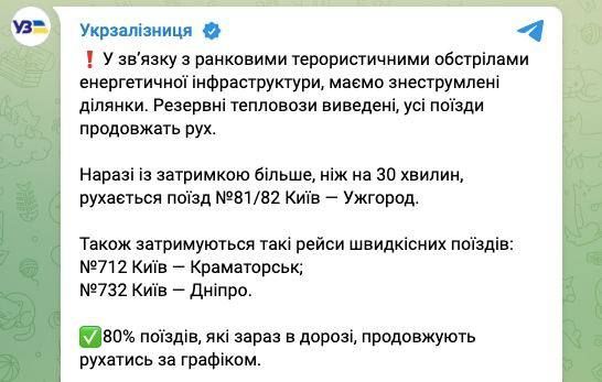 У зв’язку з ранковими терористичними обстрілами енергетичної інфраструктури маємо знеструмлені ділянки. Резервні тепловози виведені, усі поїзди продовжать рух, про це зазначили в Укрзалізниці.