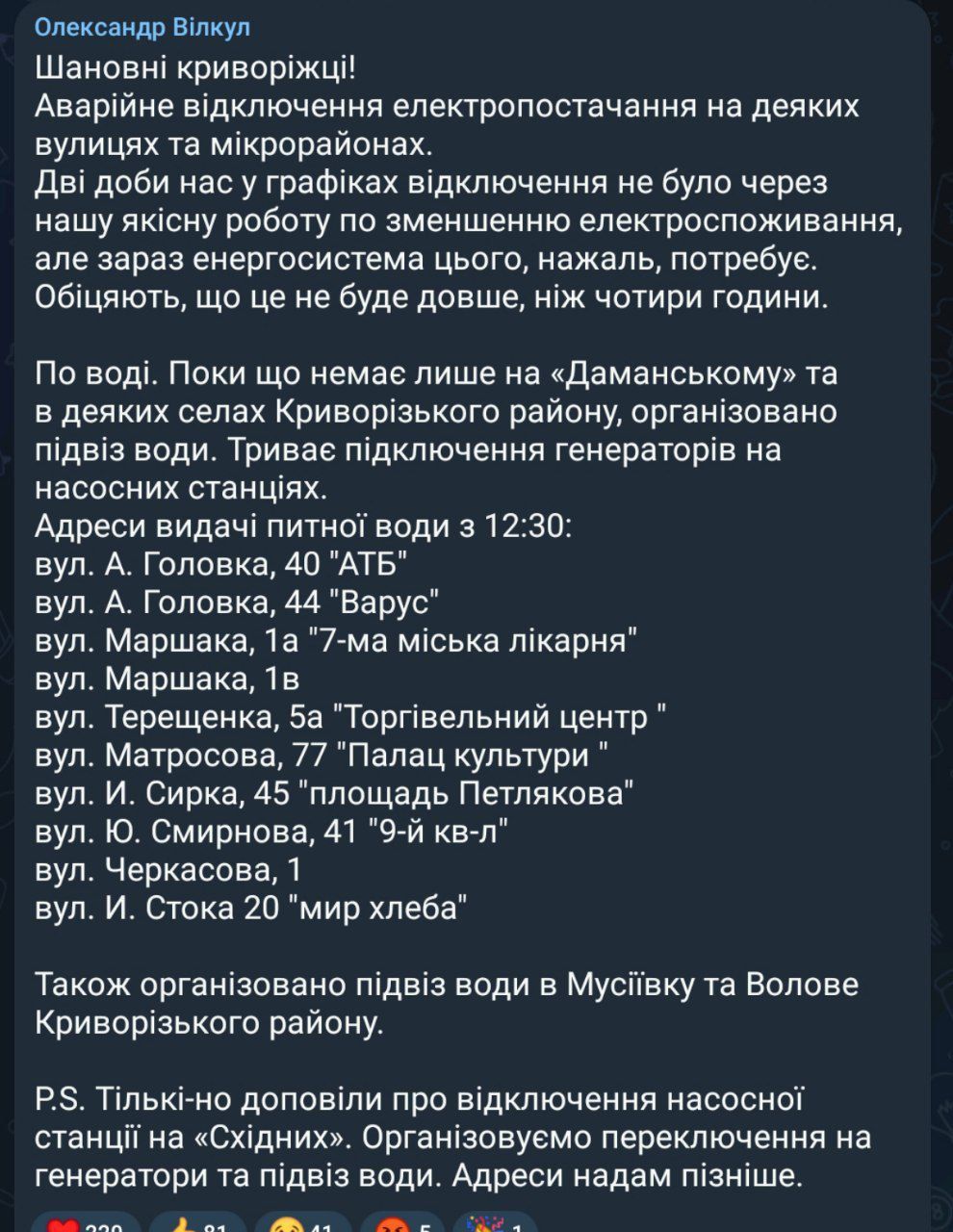 Через віялові відключення світла частина Кривого Рогу та райони без світла. Пропала і вода.