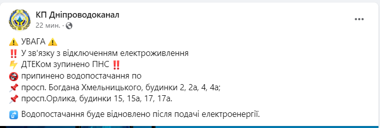 Через відключення світла деякі мешканці Дніпра залишилися без води: адреси