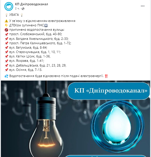 Через знеструмлення деякі мешканці Дніпра залишилися без води: адреси