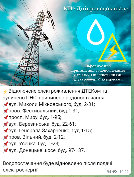 У Дніпрі та області застосовано екстрені відключення світла. Без напруги вже і водопроводні насосні станції, тому мешканці Дніпра залишилися без води.